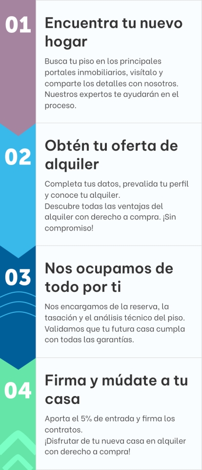 En Gradual puedes elegir cualquier piso en el mercado sobre el cual tendrás un derecho exclusivo de compra. Debes permanecer un mínimo de 3 años de alquiler, en los que ahorrarás hasta un 30% de la mensualidad para comprar la vivienda. Mientras, podrás pintarla y decorarla, tener mascotas... ¡Hacerla tuya!